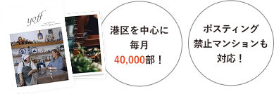 東京都港区をメインに一部渋谷区・千代田区・中央区の富裕層へ毎月約40,000部配布。yoff(ヨフ)だからこそ、今まで紙の広告の到達が難しかった富裕層へのアプローチが可能となりました。